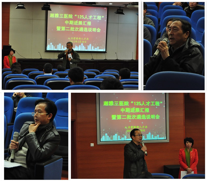 2月28日下午,中南大学湘雅三医院“125人才”中期进展汇报暨第二批次遴选说明会在外科楼学术报告厅举行。院领导罗爱静、朱晒红、邓云龙莅临会议指导,刘浔阳、罗成群、沈守荣等专家教授、部分科室主任出席了会议,全体125人才、第二批“125工程”申报者近200人参加了报告会,会议由人力资源部人才培养办主任刘新春主持。