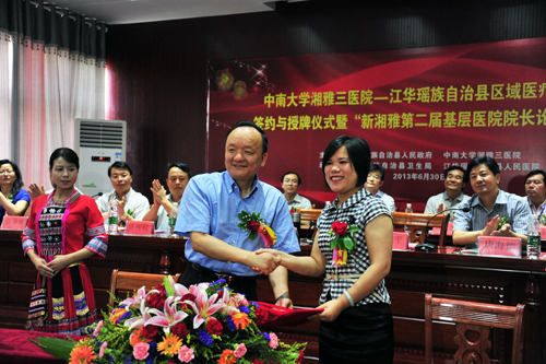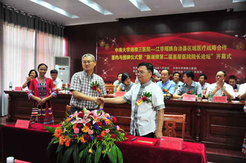 6月30日,国家卫计委直管医院——中南大学湘雅三医院和国家级贫困县——江华瑶族自治县举行区域医疗合作联盟启动仪式。湘雅三医院院长陈方平与江华瑶族自治县人民政府县长龙飞凤签署“点”对“面”医疗帮扶战略协议,湘雅三医院全面帮扶江华瑶族自治县医疗卫生事业,全面提升全县医疗服务水平;湘雅三医院副院长朱晒红与江华瑶族自治县人民医院院长李昌江签署“点”对“点”医疗帮扶协议,湘雅三医院将重点加强对该院以人才、技术、临床重点特色专科为核心的能力建设。永州市卫生局副局长唐海德,江华瑶族自治县人大常委会主任陈槐权,县政协主席李家登,副县长李博、伍继承,县政协副主席罗梅,及南岭山区的宁远县卫生局、道县卫生局、江永县卫生局负责人出席签约仪式。县委常委、宣传部长龙赋云主持签约仪式。